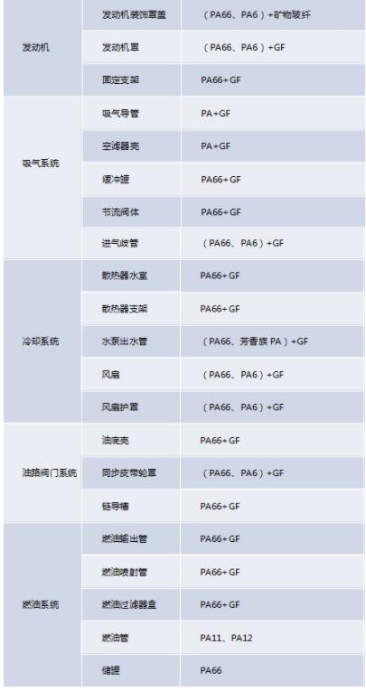 PA中PA6和PA66尼龍改性使用量占總產量的90%之上,在汽車上的運用占比也是這般,因為PA11和PA12具備優良的柔韌度,耐磨性能,耐蝕性,耐老化,超低溫延展性,防水性,規格可靠性,在汽車的輸油管道,制動系統管,汽車剎車片,汽車油箱機殼,液壓機器皿等層面有廣泛運用。用以汽車的PA材料大多數必須歷經改性,在其中添充改性、提高改性的使用量較大,此外EPDM、POE改性改性尼龍材料也是有較多的運用。最近幾年,新能源技術汽車的迅速發展趨勢,尼龍在動力鋰電池、射頻連接器、電池充電設備等構件運用迅速提升,改善發展趨勢是提升尼龍材料的流動性、耐溫性、耐髙壓起痕性、無鹵素阻燃性等性能。